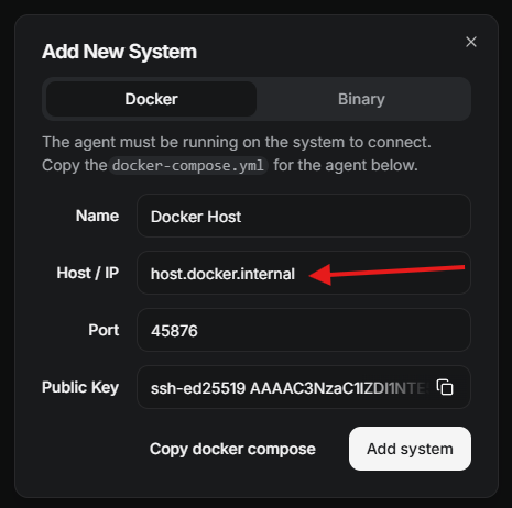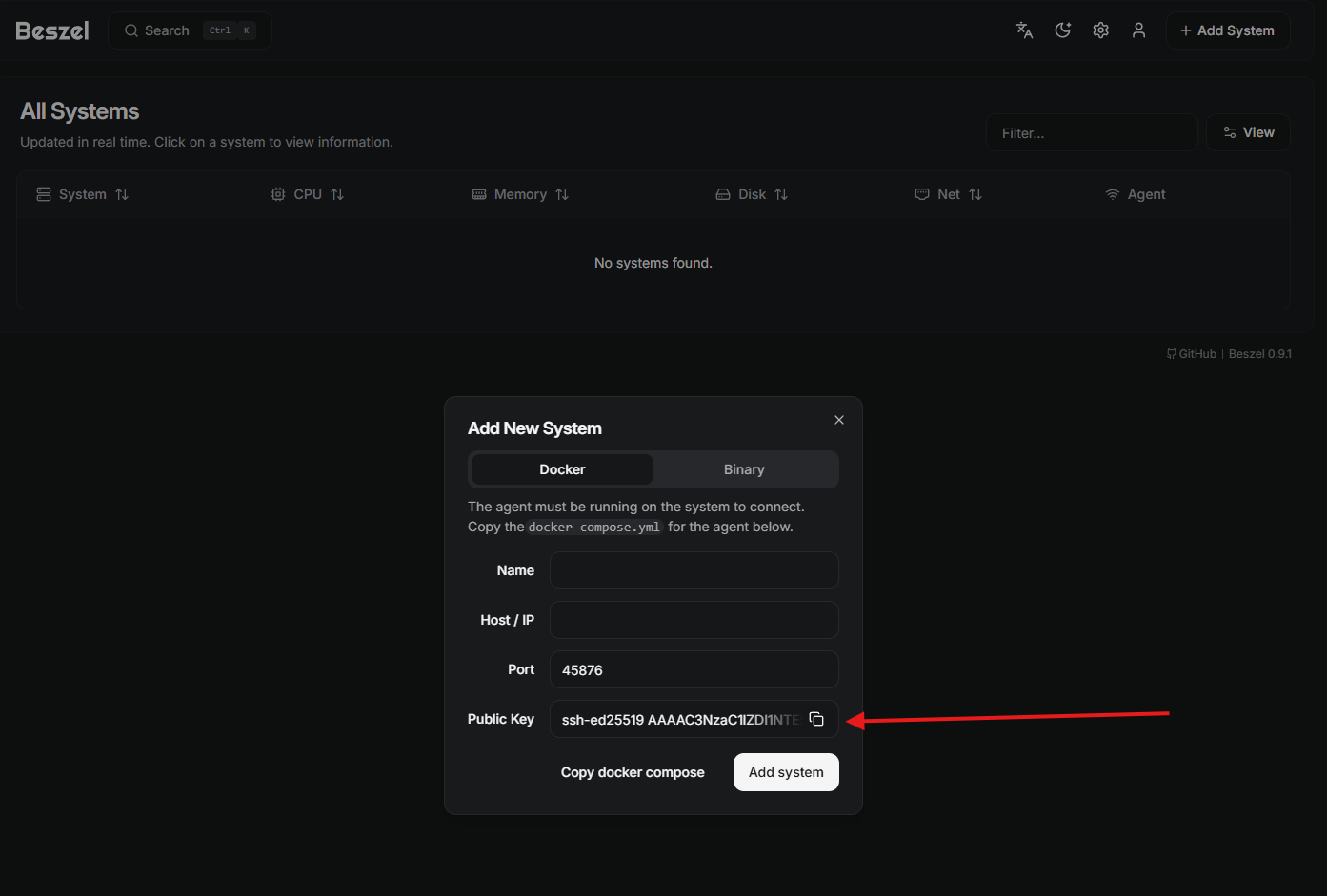 KEY: '<public key>'Now, back in Beszel dashboard, click on Add System (Top right) and