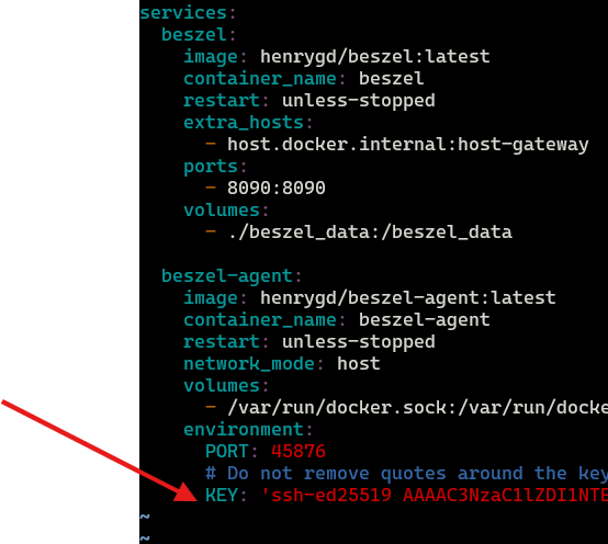 KEY: 'UPDATE WITH YOUR PUBLIC KEY (copy from "Add system" dialog)'KEY for beszel-agent as it is for now. We will come to itBring it up