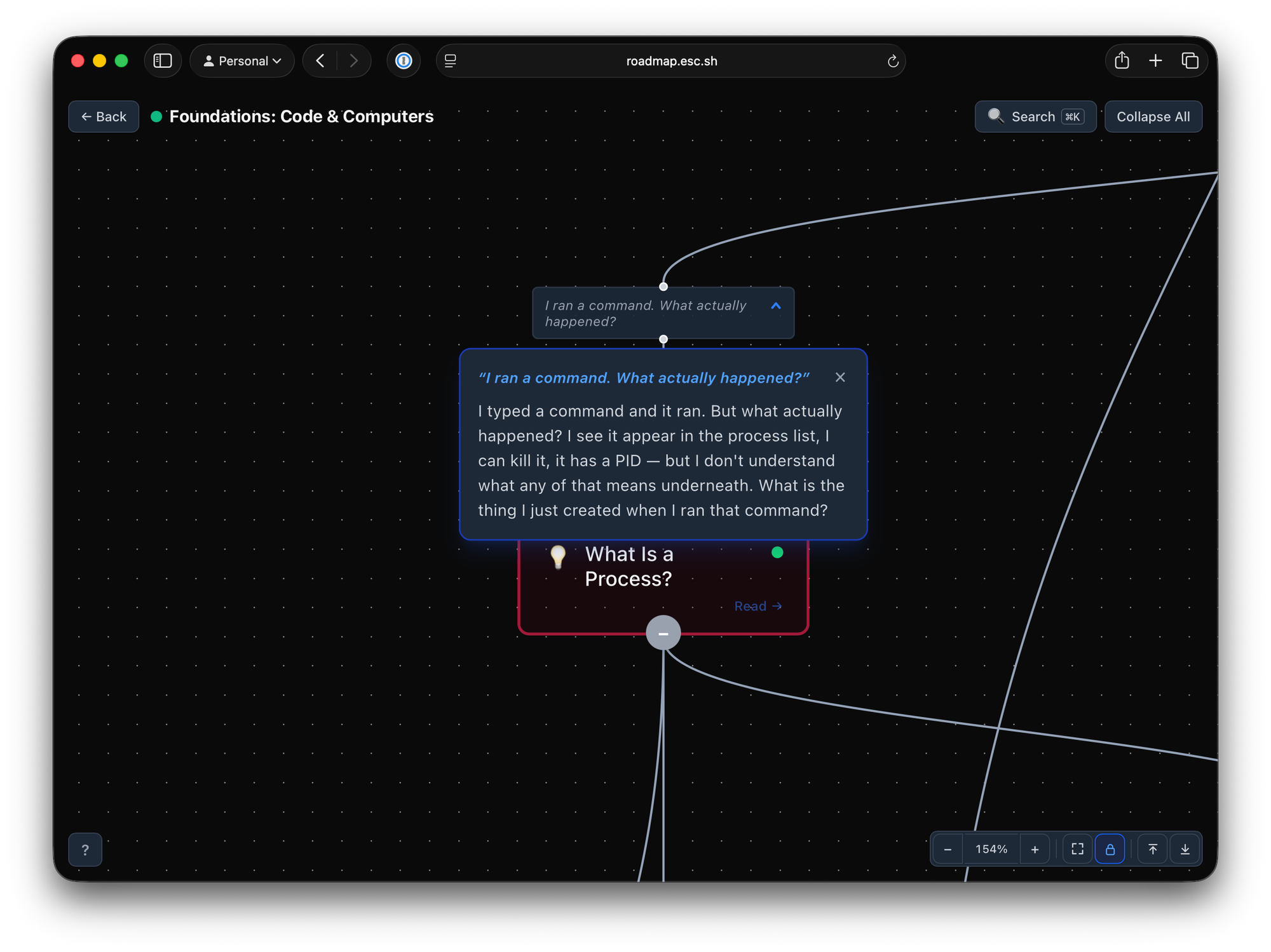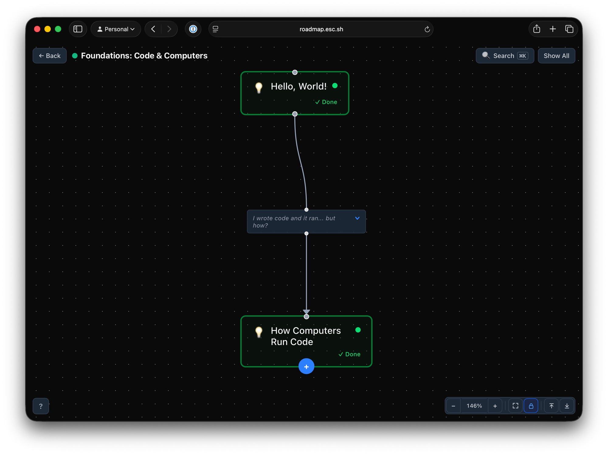 I wanted a tool that actually reflected this learning philosophy. Since I couldn't find one that didn't immediately overwhelm the user, I built one: roadmap.esc.sh.