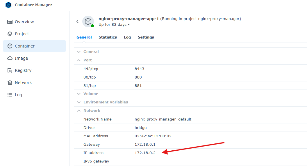 Open "Container Manager" and go to your container that is having issues. Go to General -> Network